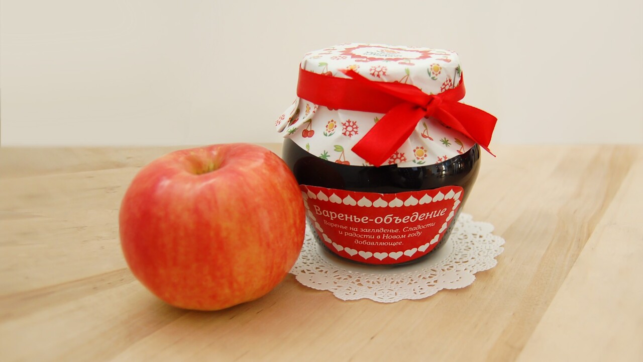 ВОПЛОЩЕНИЕ: Специально оформленная этикетка и бумажная надкрышечка, перевязанная красной ленточкой, напоминают о бабушкиных заготовках на зиму.