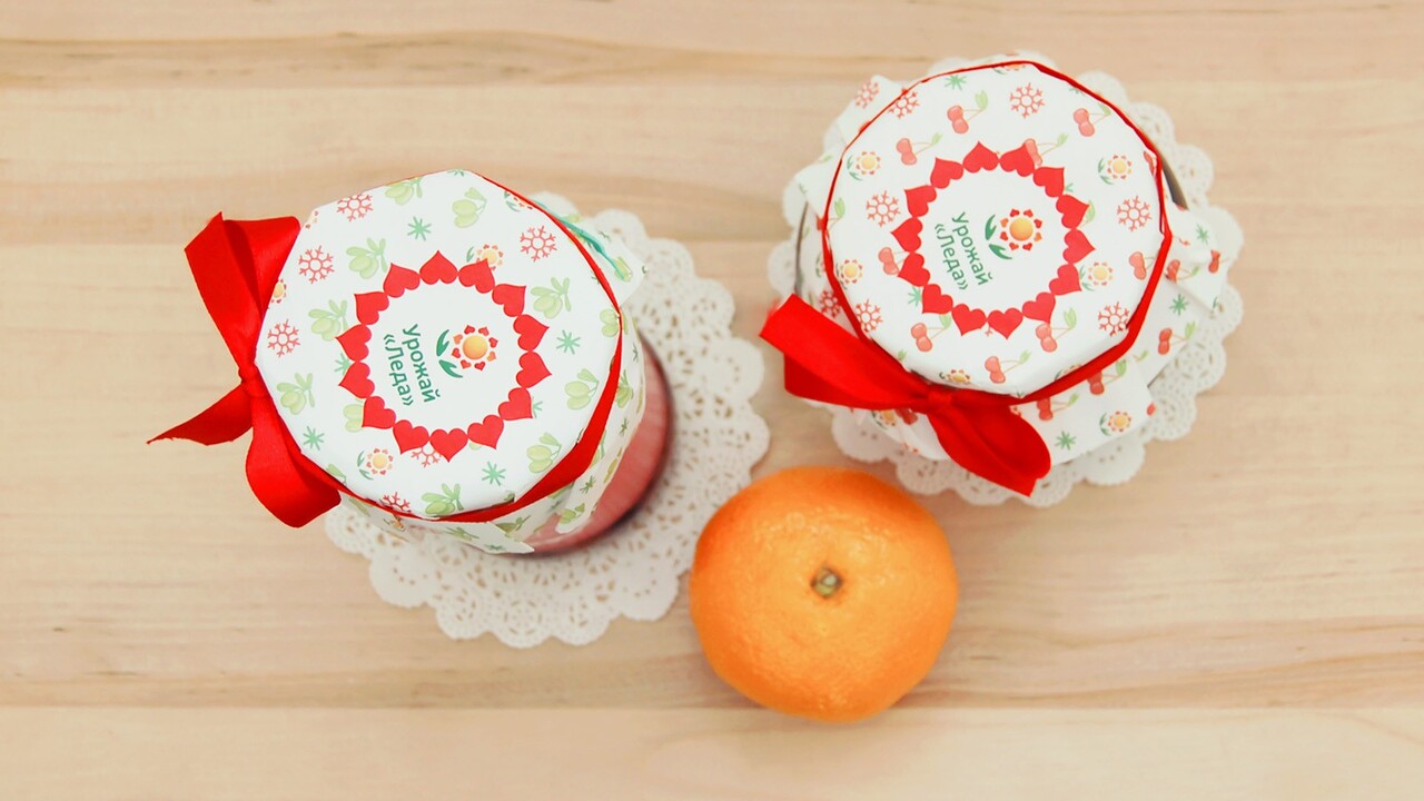 Цветовое оформление выполнено в фирменных цветах компании - красном, желтом и зеленом. На крышечке расположен фирменный блок компании, а паттерн с изображением снежинок, вишенок или оливок позволит без труда опознать содержимое баночки.