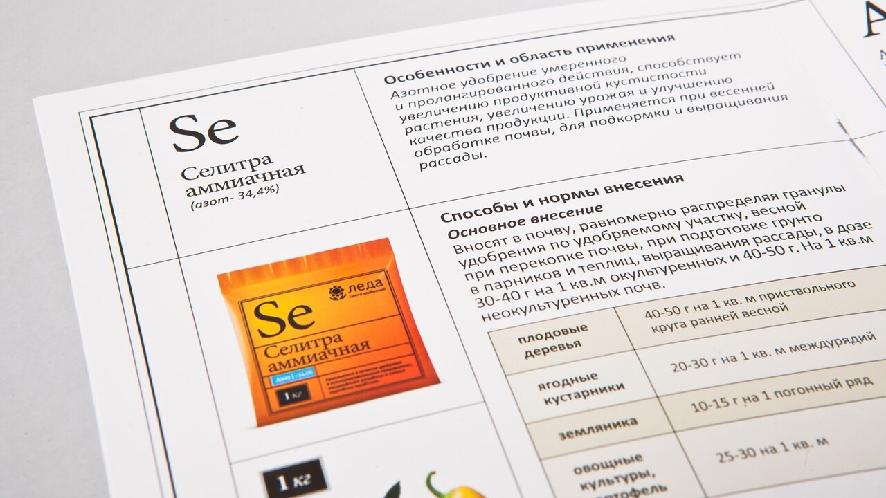 ВОПЛОЩЕНИЕ: Разработанный ранее дизайн упаковок удобрений послужил основой для общей концепции оформления буклета: куда поместить химические элементы, кроме как в периодическую таблицу уважаемого Дмитрия Ивановича Менделеева? Рамки и таблицы прекрасно организуют информацию, добавляют систематичность и точность – то, без чего невозможно обойтись в сельском хозяйстве, а изображения овощей и фруктов, гармонирующих по цвету с упаковкой удобрений, позволяют расставить цветовые акценты на каждой странице буклета.