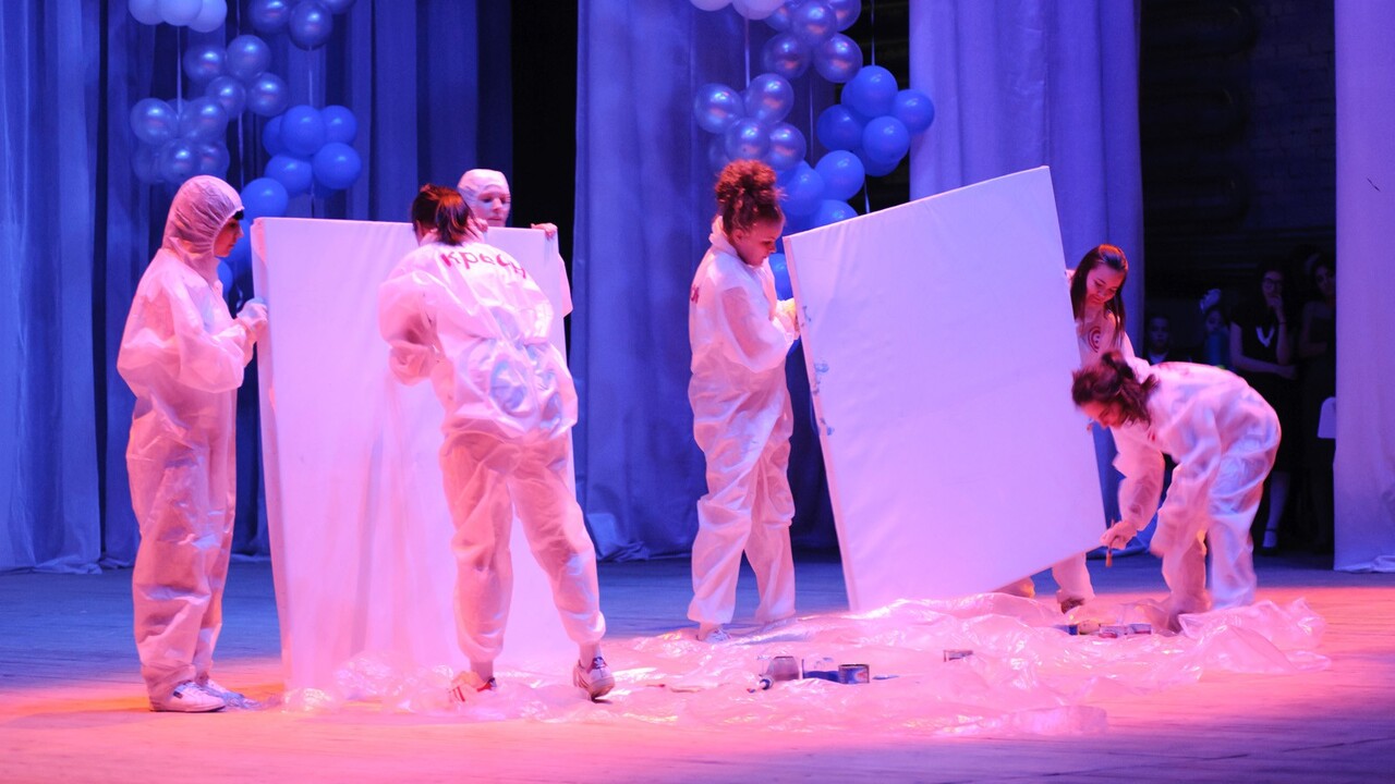 ВОПЛОЩЕНИЕ: Многочасовой просмотр аналогов скоростной перевёрнутой живописи и ежедневные тренировки в офисе дали свои положительные результаты: за 7 минут нам удалось создать интригующую атмосферу, опустить парашют из целлофана и нарисовать на двух полутораметровых полотнах здание Академии и портрет президента. Данный проект в очередной раз позволил понять, насколько сильно идея зависит от реализации. Транспортировка досок, сколачивание деревянных рам, натяжение и закрепление баннерной ткани, как ни крути, являются полноправными участниками процесса воплощения идей.