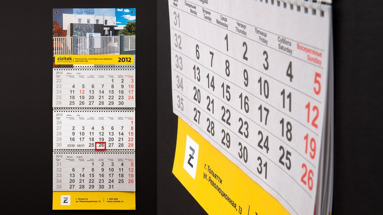 РЕШЕНИЕ: Плашка фирменного яркого желтого цвета в верхней и нижней части календаря удерживает первый взгляд смотрящего и сообщает всю необходимую информацию о компании, её специализации, вплоть до кредо: «технологии, в которых мы уверены круглый год». На верхней «визитной» части календаря разместилось изображение технологичного дома с современными воротами, установкой которых занимается «Zizitek».