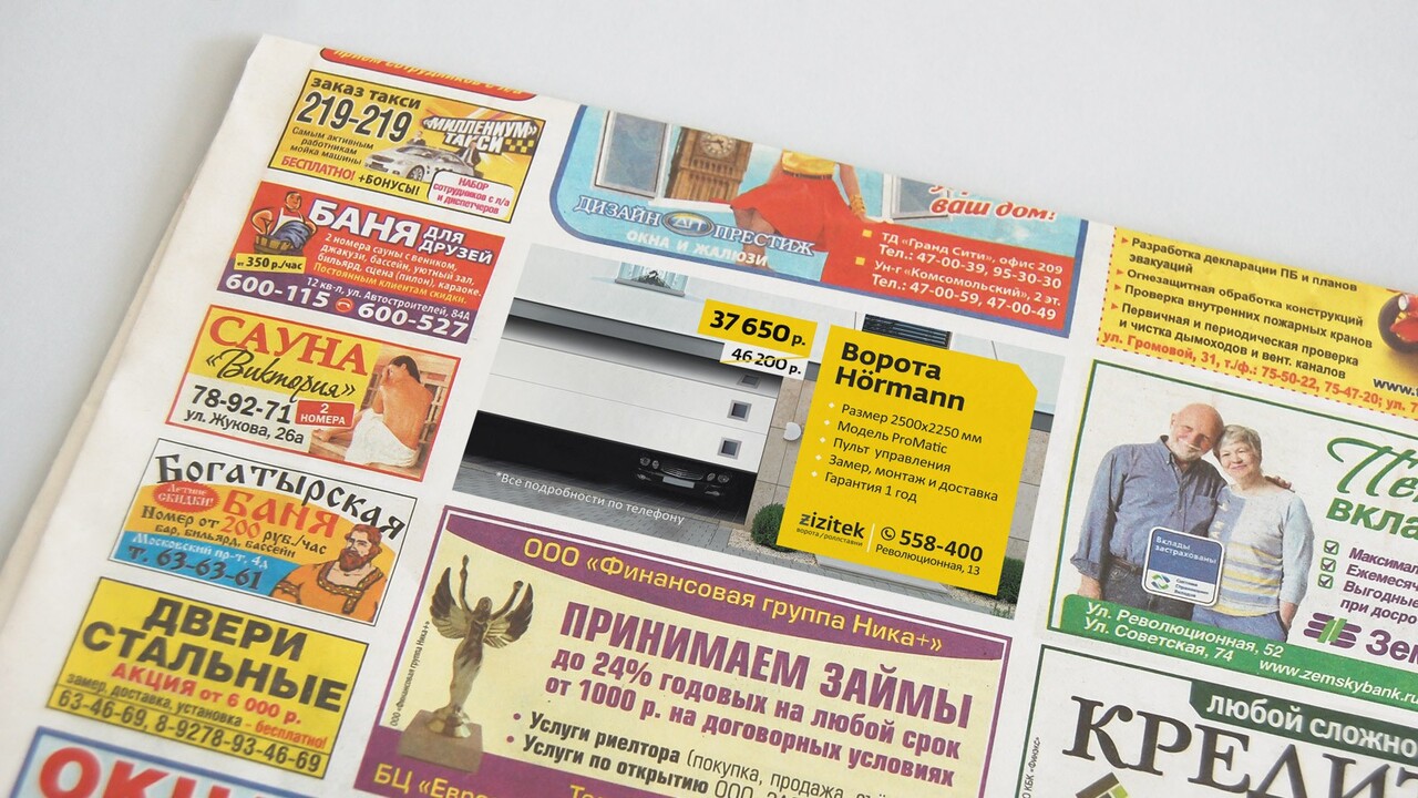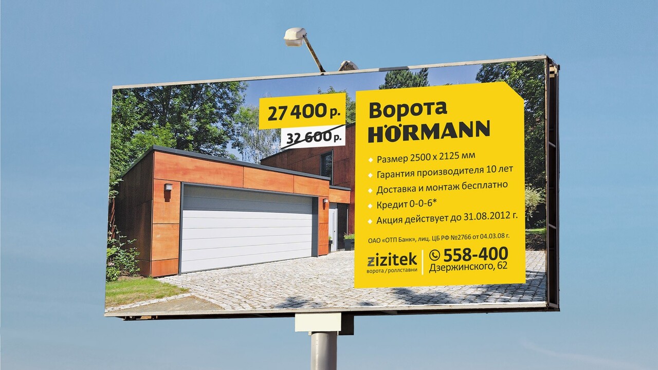 ЗАДАЧА: Разработать рекламную кампанию для производителя роллставней и ворот «Зизитек», в которой будут задействованы газетные модули и уличные баннеры.
