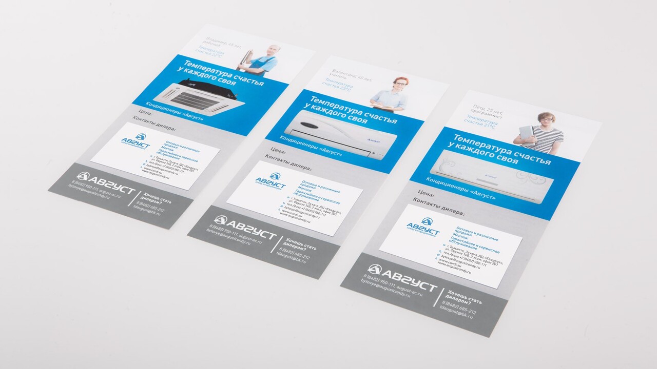 ВОПЛОЩЕНИЕ: Рекламная кампания была проведена в два этапа. Сначала жители Самарской области были заинтригованы тизерным посланием: «А какая Ваша температура счастья?». А затем познакомились с фирменными персонажами разных возрастов и профессий, которые рассказывали о том, как им удаётся поддерживать свою «температуру счастья» при помощи кондиционеров «Август». Помимо разработки дизайн-макетов наружной рекламы, производственный процесс включал в себя создание сайта, буклетов и флаеров для дилеров и покупателей.