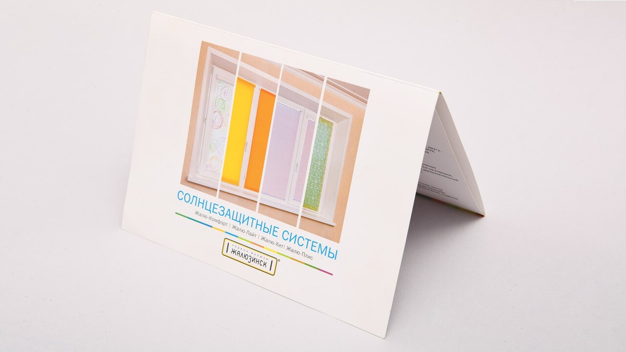 Задняя обложка буклета добавляет пунктов в имидж компании и позитивно сказывается на её репутации. «Жалюзинск» рассказывает историю компании и обращается к своим клиентам с тёплым пожеланием найти во всём многообразии продукции компании свою солнцезащитную систему. Бонус для клиента – удобный, почти карманный формат буклета.