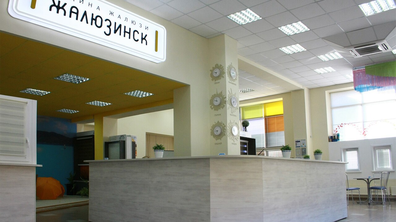 Северная сторона с завораживающим северным сиянием под потолком и западная сторона – рабочие деловые зоны для оформления заказов – символизируют холодную голову и чистый разум, которые так необходимы для принятия интерьерных решений. Южная курортная зона с шезлонгом и живописным фото побережья превратилась в пространство для отдыха и детских игр. А восточная зона, в которую покупатели попадают при входе в Жалюзинск и выходе из него, раскрашена яркими пряными расцветками жалюзи, призванными утвердить покупателя в правильности выбора солнцезащитной системы.