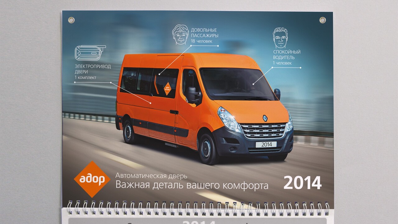 РЕШЕНИЕ: В центре внимания на шапке календаря становится автомобиль, который оснащен автоматическим приводом (дверью-автомат). Так на чем же строится комфорт от использования технического совершенства? На довольствии пассажиров, спокойствии водителя, и все благодаря единственному комплекту автоматики. В макете заложено движение: автомобиль с фото буквально врывается в пространство перед календарем. Дорожная полоса размыта от быстрой скорости, фото приобретает кинематографический шарм и драматизм. Машина, оснащенная приводом-автомат, не снижая скорости, движется по обложкам подарочной папки и блокнотов компании. Слоган «10 лет на дорогах страны» отражает юбилейный рубеж и солидный опыт компании.