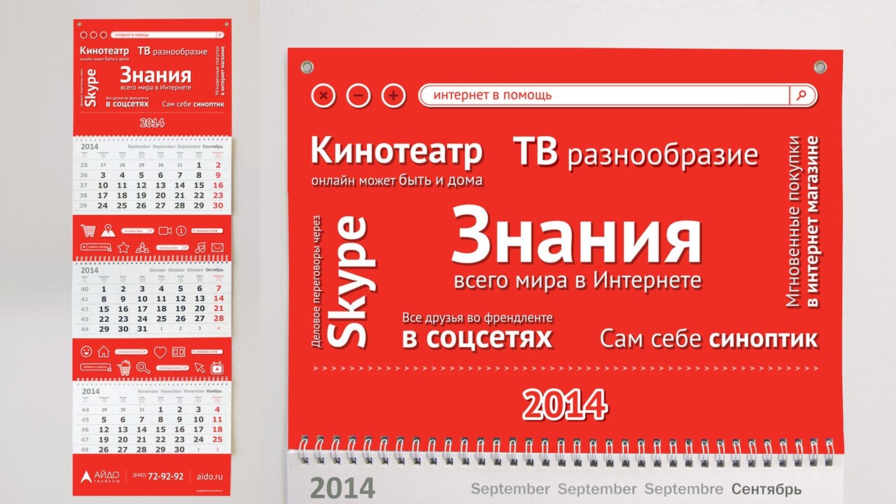 РЕШЕНИЕ: …календарные поля щедро украшены полезными интернет-возможностями (дружеское плечо в этих вопросах своим пользователям подставляет «Айдо Телеком») и бесшабашными интернет-запросами, которые могут помочь практически в любом вопросе (и от души повеселиться тоже). Фирменный красный цвет и ключевые элементы поискового сервиса создают образ интернет-советчика по имени «Айдо Телеком». Актуальная тенденция flat-дизайна (плоских иконок, изображений), популярная в последних версиях операционных систем, отразилась в форме всех элементов композиции – поисковых строках, текстовых составляющих.