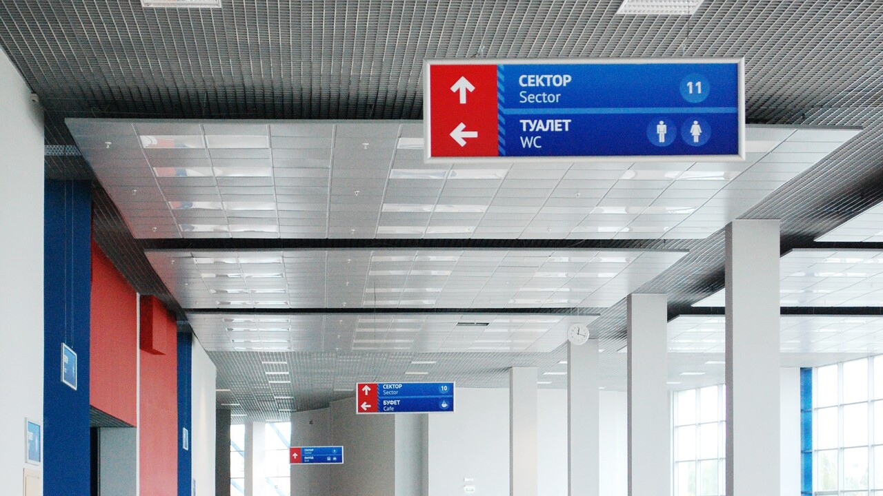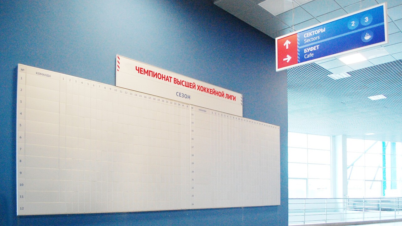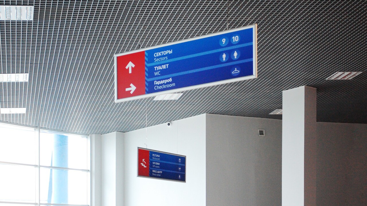 РЕШЕНИЕ: Два фирменных для ледового дворца цвета: жаркий красный и морозный синий расцвели на всех носителях. Разметка из полосок приобрела текстуру, напоминающую иней. Изображения-иконки, которые иллюстрируют маршруты для спешащих болельщиков, обосновались на указателях, прикрепленных к стенам и подвешенных к потолку. На стенах развернулись информационных площадки в виде табло с фирменными полосками и красной текстовой разметкой.