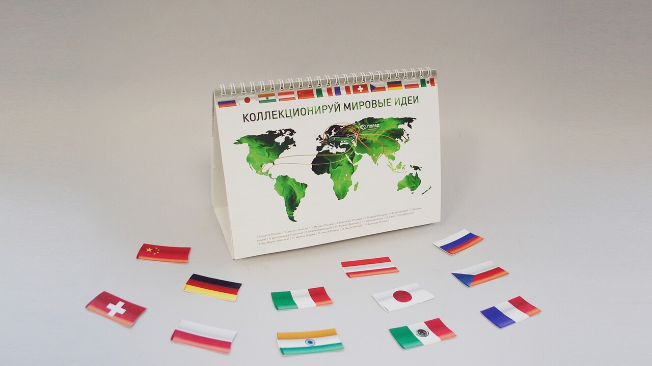 РЕШЕНИЕ: Компания постигает тонкую науку искусства управления и рассказывает об уже обретенном опыте. Географическо-культурный календарь каждый месяц повествует о конкретной стране, характере её жителей и тому, как этот характер помогает решать бизнес-задачи. Кастинг принципов и методик осуществлялся со всей строгостью, а их лаконичность не менее тщательно оттачивалась, для слоганов-фраз. Принципы менеджмента сформулированы как профессиональный кодекс и задачи сотрудника «Полад». Концепция развивается в типографической композиции, в которую емко закладываются смыслы текста. Каждая страница выполнена по композиционной схеме: географическое расположение страны-мудреца, её символ и флаг. Атмосфера технологичности и технической направленности работы компании достигается за счет стального серебристого фона. Квартальный календарь делится кредо компании на целый год и посылом для аудитории «Внедряй мировой опыт».