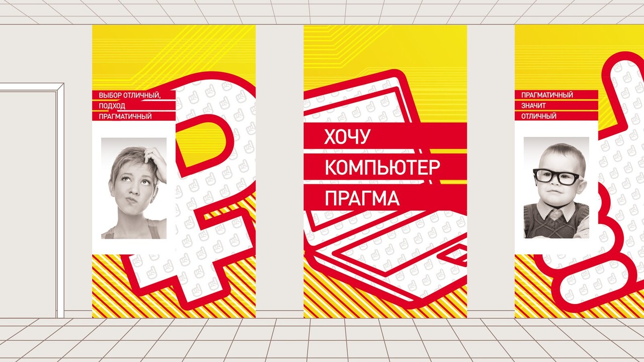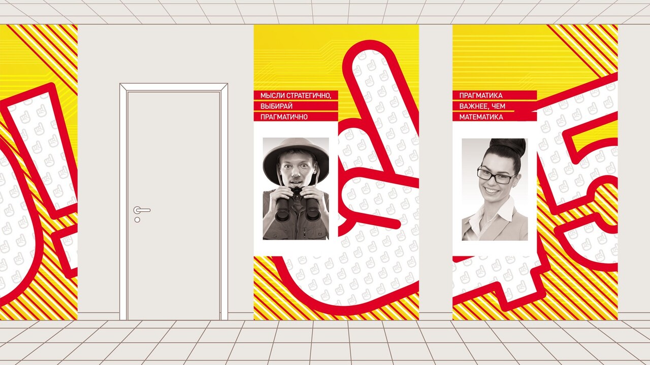 РЕШЕНИЕ: В ходе реализации проекта было разработано несколько типов носителей: навигационные элементы, входная группа и плакаты. В унылом сером коридоре по обеим сторонам появились яркие цветовые пятна, радующие взгляды как гостей офиса, так и работников. На плакатах - подборка из забавных фотографий, веселых рифмованных слоганов и графических элементов. А перенесение фирменного стиля с малых носителей на офисное пространство позволило расширить Прагма-мир.