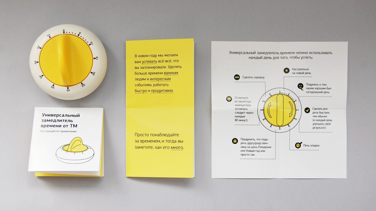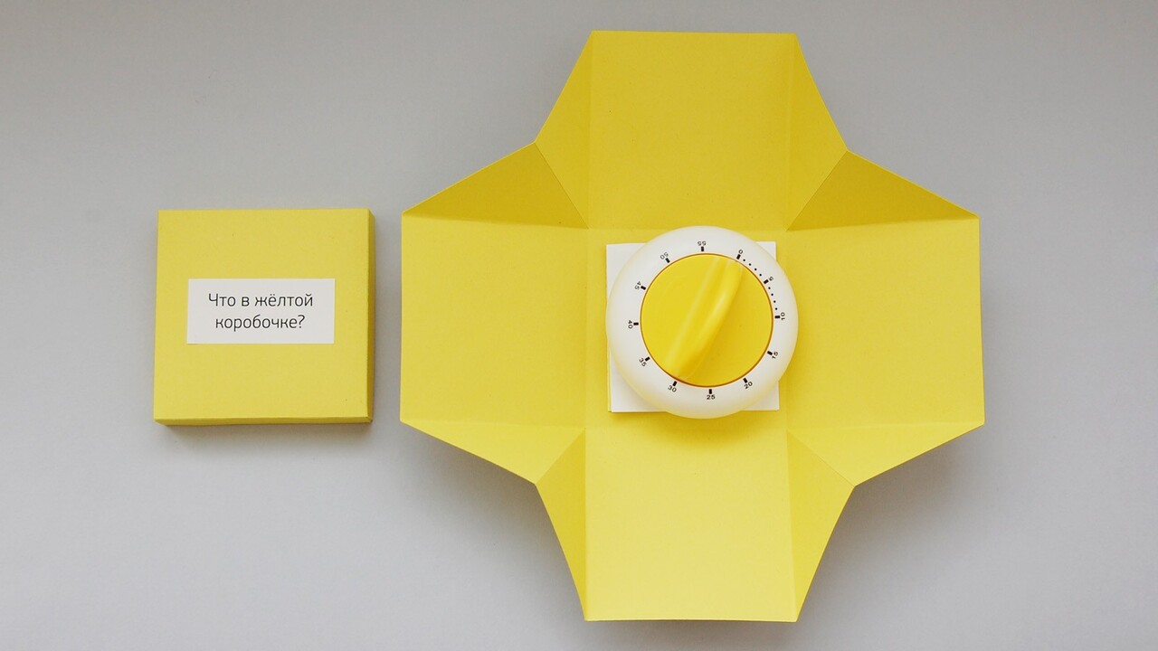 РЕШЕНИЕ: Жёлтый куб открывается просто, в нём универсальный замедлитель времени – он же многофункциональный таймер с позитивной инструкцией по применению. В ней подробно расписано, как можно и насколько важно выделять время на разные «приятности» и «полезности», которые часто остаются за пределами человеческих возможностей.