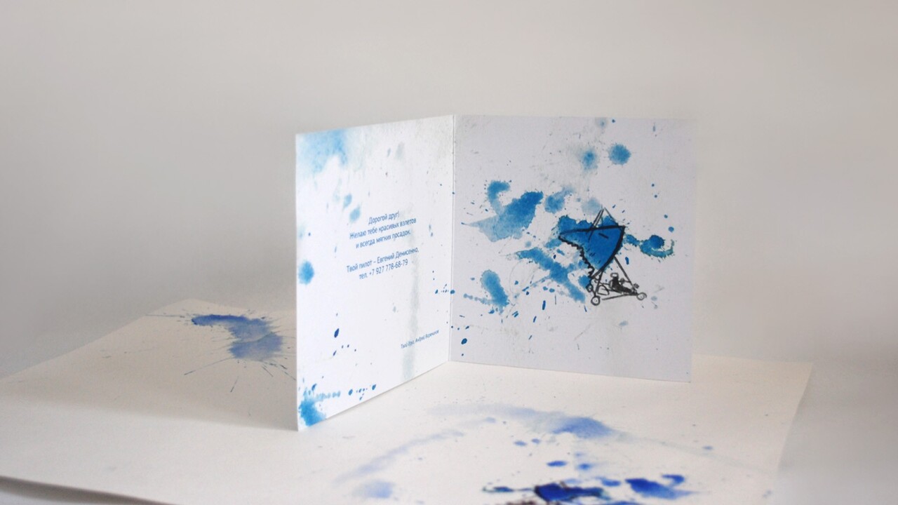 РЕШЕНИЕ: Основу упаковки для будущего эмоционального подарка составила акварельная зарисовка из капель, брызг и разводов, оставленных синей краской. Затем твердая и уверенна рука дизайнера обвела получившийся эскиз таким образом, что миру явился дельтаплан и его храбрый рулевой, который парит в акварельных облаках. Текстовое послание приобрело личный и теплый посыл, который, с одной стороны, желает яркого события, а с другой, применим в целом к жизни.