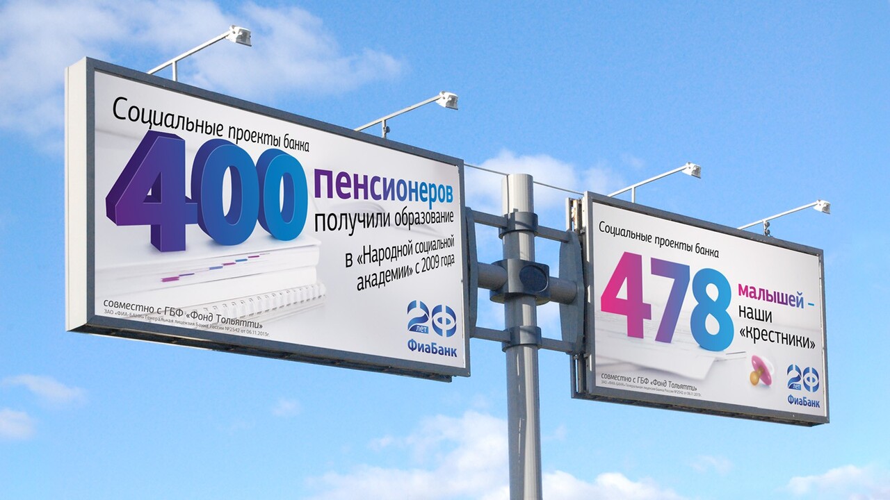 РЕШЕНИЕ: Каждый носитель рассказывает городу одну мини-историю а-ля «банк в числах». На первый план выходит числовое измерение успеха и краткое к нему описание. Число – смысловой и композиционный центр, оно приобретает лоск, текстуру и объем, а вся композицию за счет незначительных деталей каждый раз новое настроение и атмосферу. Свежая фирменная гамма раскладывается на несколько фирменных оттенков и цветовых акцентов, которые соединяются в стремительный уходящий за горизонт графический элемент. Новый вектор развития задан!