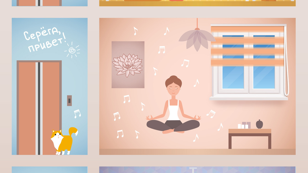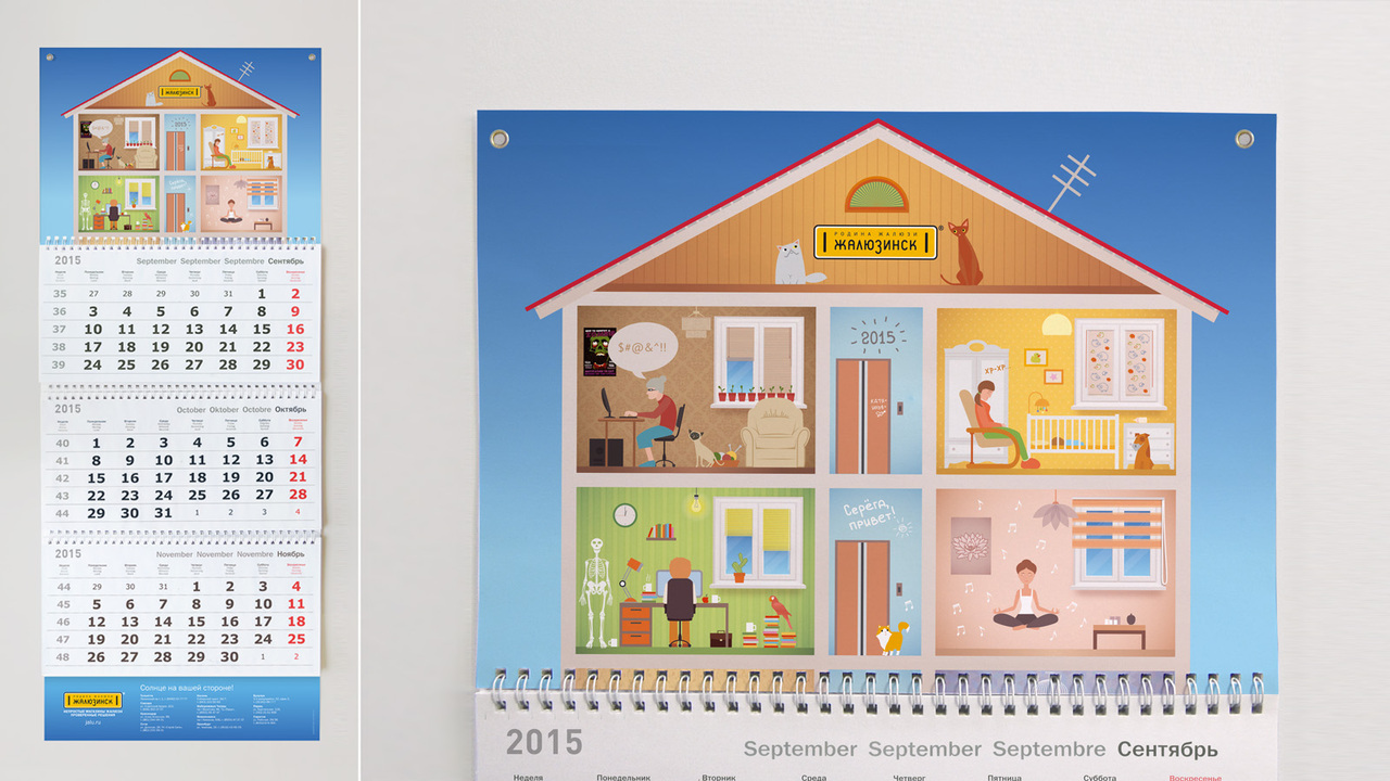 РЕШЕНИЕ: мы все разные, но жалюзи нужны нам всем. Отсюда — дом, жители которого занимаются своими повседневными делами. Каждое дело можно отметить в календаре. У каждого персонажа в квартире жалюзи.