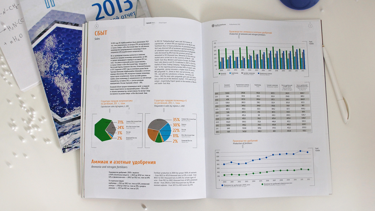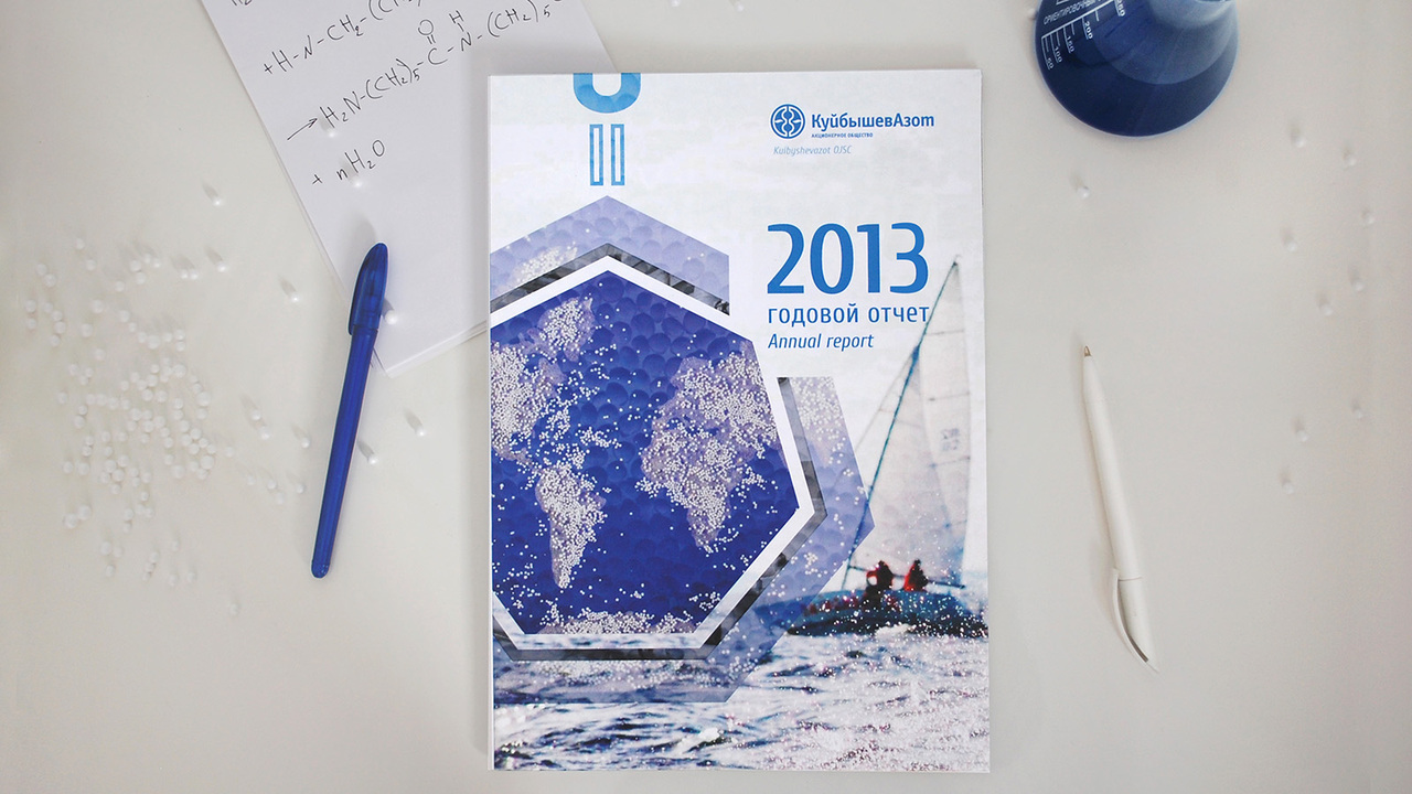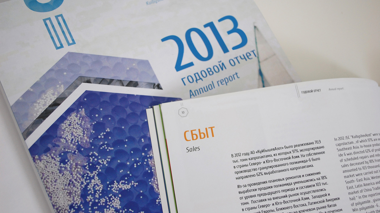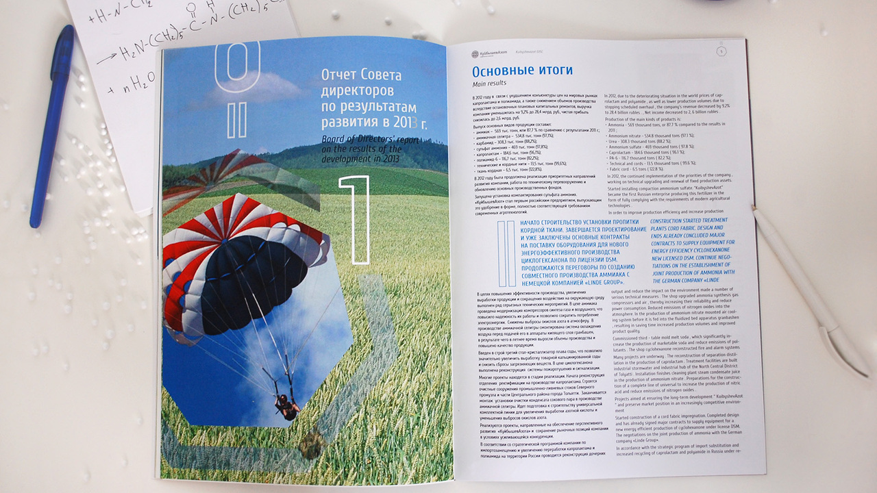 РЕШЕНИЕ: Обложка открывает тему химической формулы, вводит на страницу форму семигранника (характерную для продукции; например, капролактама). Т.к. текст представлен на двух языках, то очередность восприятия информации определена цветом и яркостью. Таким образом, иноязычным дублем-колонкой обзаводится каждый текст. В колонтитулы вынесены логотип завода, надпись «Годовой отчет». Номера страниц заключены в семигранник.