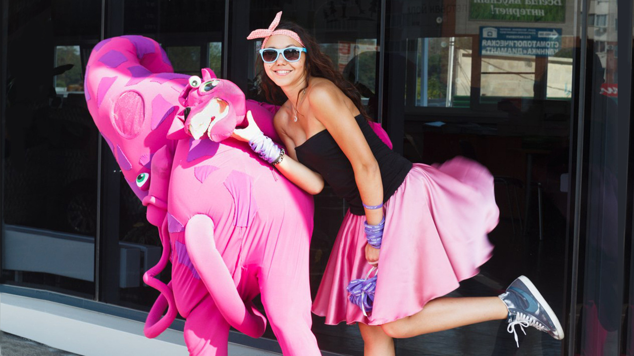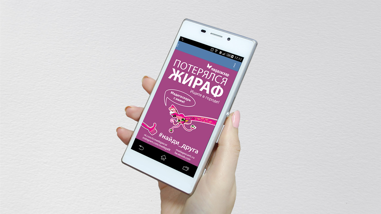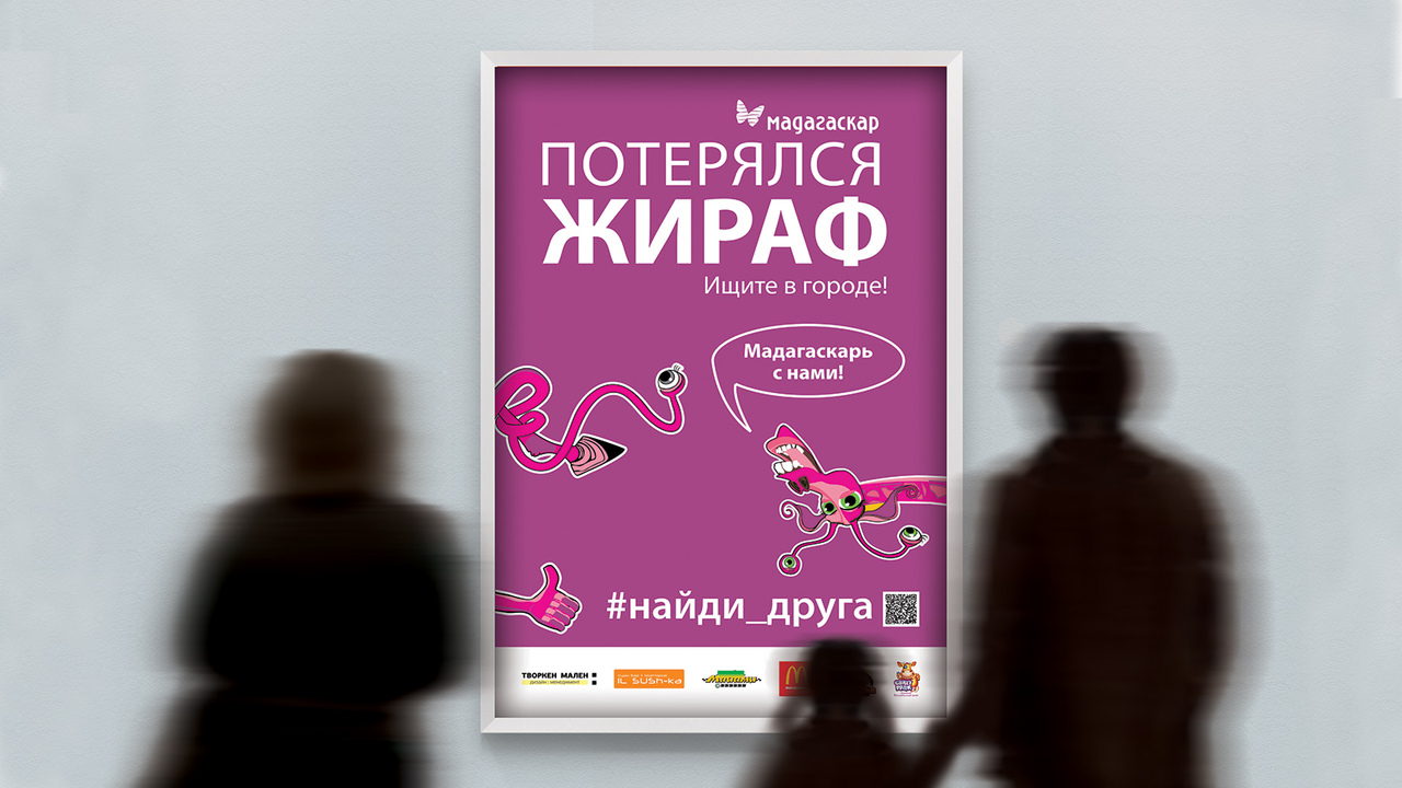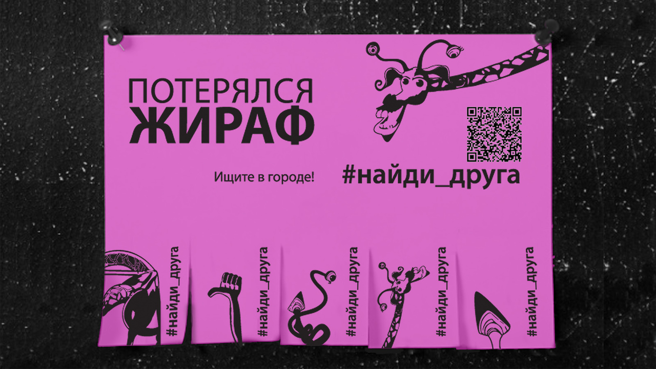 РЕШЕНИЕ: в городе потерялся жираф, и его нужно найти! Он появляется в разных местах в городе, ставлял следы и фотографировался со всеми желающими. Были разработаны баннеры, наклейка на авто, объявление, браслеты.