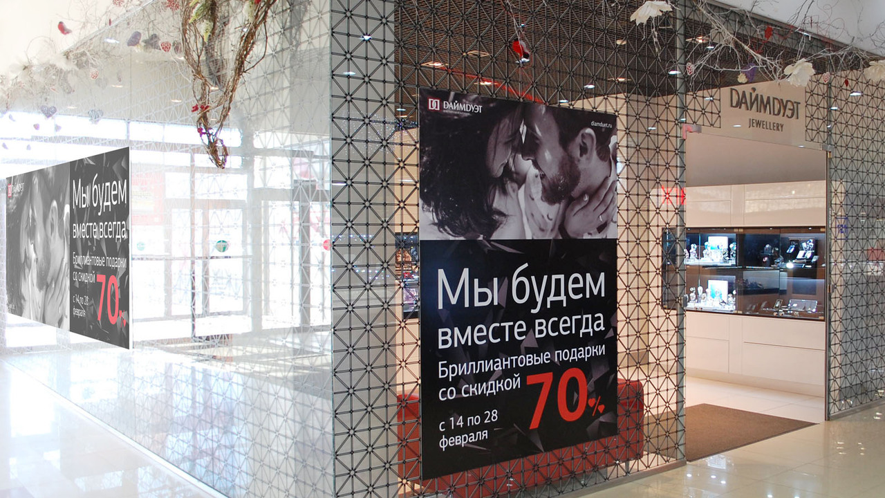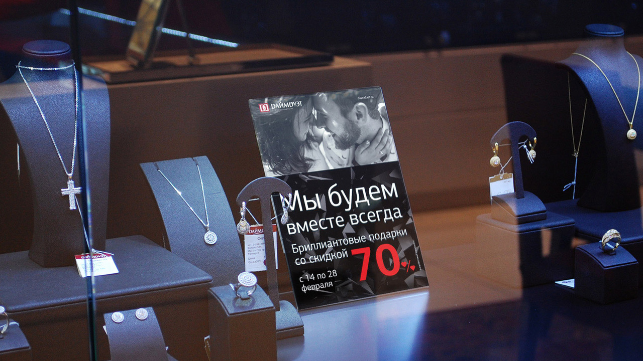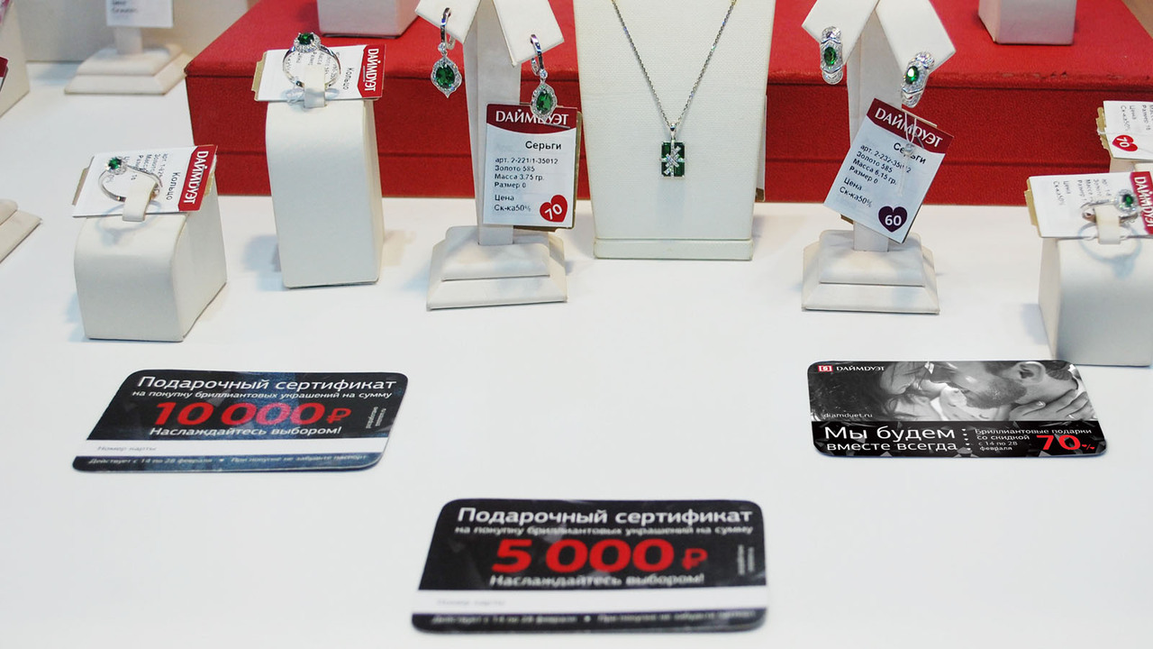 РЕШЕНИЕ: после подробного анализа ("тайный покупатель", диагностика точек контакта) было предложено средство сбора статистики и покупательской активности "Карта желаний". Разработаны генеральный визуальный образ, транслирующий идею бриллиантовых украшений как "вечных ценностей", система сезонных акций, слоганов, партнёрская программа, подарочные сертификаты.